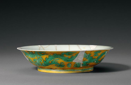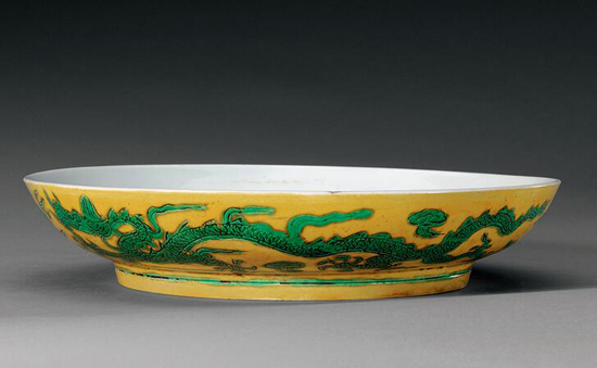 黄地绿彩瓷器应该说烧得最成功的是正德,这些盘、碗有很多里边还有锥拱的暗花,都很讲究,在釉下叫暗花。黄地绿彩历朝都在烧制,到清代作为大运瓷器的传统品种,黄和绿的色彩对比鲜明,装饰效果非常好看,很受人们喜欢。