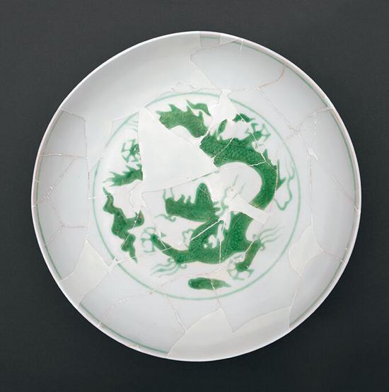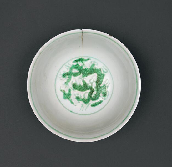 明代白地绿彩瓷器以弘治、正德朝产品最为多见,其釉色白中闪青,绿彩闪黄,色调柔和。