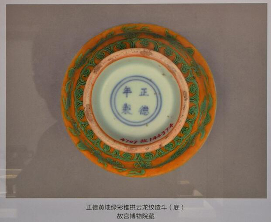 该部分展柜背景图所展示的正德黄地绿彩锥拱云龙纹渣斗(底)图
