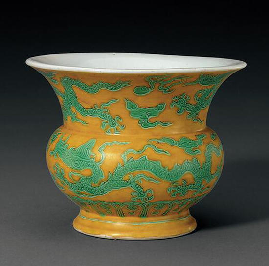 黄地绿彩锥拱云龙纹渣斗 明正德(高11.2厘米 口径14.6厘米 足径8.4厘米)