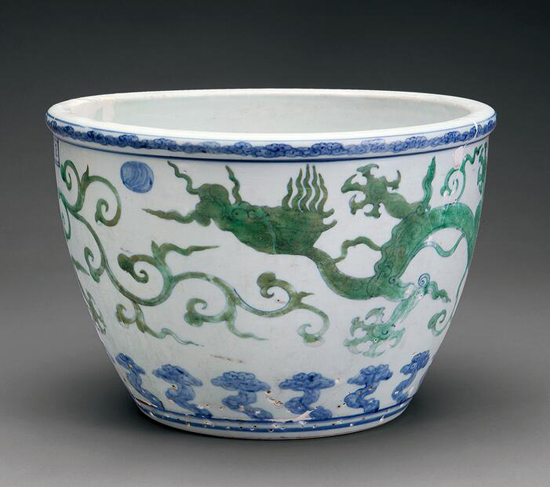白地绿彩云龙纹缸 明正德(高23厘米 口径35.5厘米 足径20厘米)