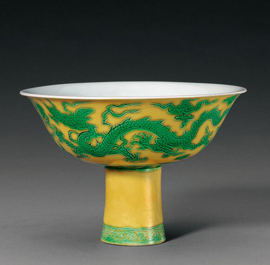 黄地绿彩锥拱云龙纹高足碗 明正德(高10.5厘米 口径15.8厘米 足径4.3厘米)