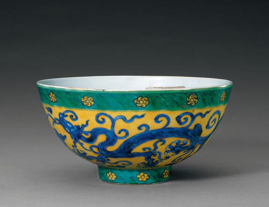 黄地青花螭龙纹碗 清雍正(高8厘米 口径16厘米 足径5.6厘米)