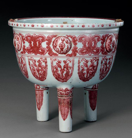 釉里红三足炉 明正德(残高10厘米 口径24.5厘米 足径23.8厘米)