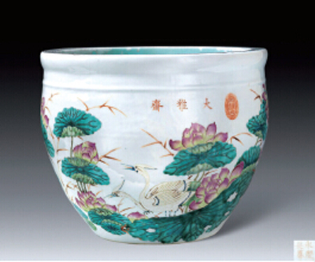 “大雅斋”粉彩荷塘鹭鸶纹缸