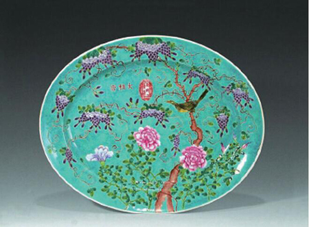 “大雅斋”松石绿地粉彩藤萝花鸟图椭圆盘