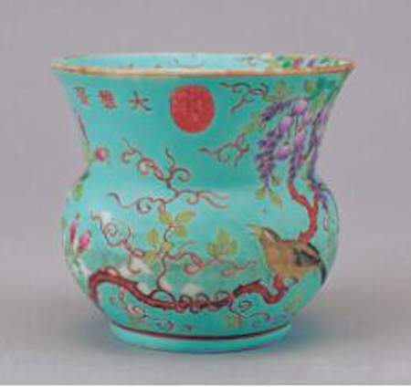 一、品种十分丰富,多日用瓷。“大雅斋”瓷器是为慈禧太后专门烧制的堂名款瓷器,准备烧成后在大雅斋中使用的,故而其品种十分丰富,涵盖了陈设和日用的多种器形。其中陈设用瓷有:花盆、盆奁、鱼缸、花瓶。还有高足碗、高足盘等供器器形。日用瓷有如下几种:碗(因尺寸不同分为海碗、大碗、中碗、怀碗)、盘(分为九寸盘、七寸盘、五寸碟、三寸碟)、茶碗、盖碗、渣斗、圆盒子、长靶羹匙。其中渣斗的造型尤其小巧,高大约在8 厘米左右,口径 9 厘米,便于随身使用。
