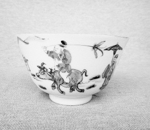 这只茶盅口径10.5厘米,底径4.3厘米,高8.7厘米,为粉彩瓷。茶盅表面绘有图案,正是古人的清明踏青出游。只见群山隐约,山色朦胧,远处氤氲一片,似乎在下着蒙蒙细雨。画面中心位置,有一个古代装束的老者正在缓缓前行,他笑呵呵地举着伞,望着前面的孩童。孩童骑在一头灰牛背上,左手拿着缰绳,右手扯着风筝线,任由风筝飞在天上。在他们的不远处,有一处高大院落,层层台阁;树木无叶,枝条倾斜着伸向天空,就像一双双能够托起太阳的手掌。在院落门前,有木条扎成的篱笆;篱笆旁边,有两块圆滚滚的大石头;石头后面,有一棵杏树,正灿然地开着满树的花朵,粉嫩粉嫩的,和青条绿叶相映成趣。