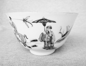 在茶盅底部,有大清光绪年制的底款,看来正制作于该时期。光绪年间,正是我国最后一个封建王朝清朝的黄昏之旅,国家内忧外患,官员自保不暇,百姓人人自危,似在走向穷途末路。制作茶盅的匠人,大概也希望能像画面中的老者一样,回乡隐居,在山间林舍终老一生。但对于受官府管控的皇家官窑工匠来说,这样的愿望,无异是一种可望而不即的奢望。