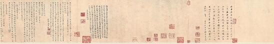 《平复帖》的命运在唐代出现了转机。尽管唐代张彦远的《法书要录》与张怀瓘的《书断》都未提到陆机。而李嗣真在《书后品》中把陆机与谢朓、李夫人、萧伦等列为“下上品”,仅是说:“陆平原,李夫人犹带古风。”但贵为天子的唐太宗李世民对陆机相当推崇尊重,亲撰《陆机传论》,评陆机谓:“风鉴澄爽,神情俊迈。文藻宏丽,独步当时;言论慷慨,冠乎终古……故远超枚马,高蹑王刘,百代文宗,一人而已。”诚然,李世民主要是褒扬其文学成就,尊其为“百代文宗,一人而已。”但“文宗”称谓的首肯,其《平复帖》的影响力自然得到了极大的提升。唐代李家王朝也成了最早将《平复帖》收入皇府的藏家。据史料记载,《平复帖》至唐代被收入《晋贤十四帖》,原与谢安的《慰问帖》同在一轴,被驸马都尉李玮所收。