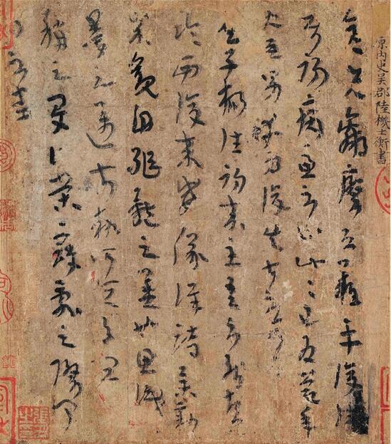 《平复帖》的笔法虽然保持了章草中锋特行的篆籀之意,并达到了奇谲古奥的境界,这正凸显了陆机深厚的学养和精湛的造诣。但其运笔却洒脱跌宕中见劲捷苍涩,信笔纷披而婉约使转,因而观其线条疾涩互用而扭绞交替,笔调生动而摇曳多姿,从而去掉了传统章草波磔横挑和燕尾捺笔。其结构则朗逸潇散而疏密自如,变化协律而顾盼自如。特别是颠覆了传统章草平正端庄,字心平稳的结体特点,欹侧对应而斜倾互依,险中求稳而动中见静,从而具有一种动感张力和视觉变幻。其章法则蓄势内敛而笔意纵横,气韵相连而意畅神合。尤其是将传统章草字字独立、横向收笔,改为了上下呼应,牵连纵引,从而笔断意连、呵成一气,产生了空间贯通性、线条承继性与节奏畅达性。其墨色则凝重沉郁而枯涩交替,华润雍容而燥妍相映,诚如孙过庭《书谱》所言:“带燥方润,将浓遂枯;泯规矩于方圆,循钩绳之曲直,乍显乍晦,若行若藏。”充分展示了章草向今草转折期的书体信息与笔墨契机。在陆机之前的钟繇、索靖、皇象等人都是拓本,均无墨迹本传世。《平复帖》作为千古第一文人墨迹之作,在墨法上具有物化范式的“墨皇”价值和质感效果的“祖帖”意义,第一次在中国书法史上以笔法、结构、章法、墨象等,演绎了:“穷变态于毫端,合情调于纸上。”