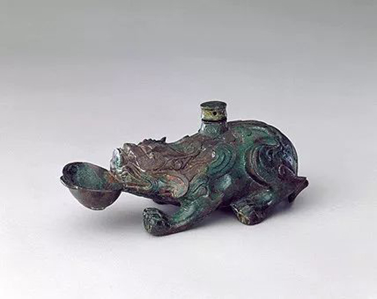 唐代砚滴形制小巧,造型别致,除有瓷制品外,还有铜制品,导入龟形砚滴,造型为一龟口衔小碗,龟背有柱形钮,龟甲雕刻精湛细腻,为唐代砚滴中的精品。