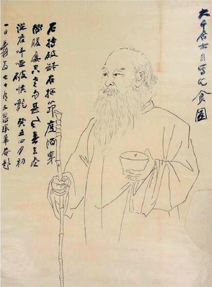我见到的大千自画像中,最感奇特的要数《大千居士自写乞食图》,这幅“乞食图”,作于1975年癸丑四月初一。说它奇特,奇就奇在画像的取材,不仅是他自己从未画过,别人怕也未曾画过,是独一无二的孤品。只见他右手拖着一根竹筇(俗称讨饭棍)左手托着一只破钵(又称要饭碗),作求乞状。