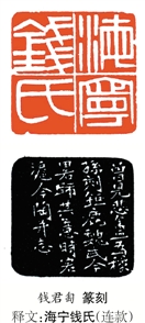 印章至秦汉,犹诗之在唐,是古代这一门传统艺术的高峰。从来篆刻家多奉秦汉印为宗,然徒从外形模仿者多,得其神韵者少。有的人只是将印面弄得残缺斑驳,便以汉印自居,殊不知印之在汉,印面也都是完整的,因经年在泥土中腐蚀之后,便有了残缺斑驳之厚重感。君匋先生学习秦汉,出入自然,师古而不泥古。如“君匋之玺”、“君匋信玺”、“弄潮”诸印。其中尤以拟古代烙马印“日庚都萃车马”作的巨印“午斋钱塘之玺”为最,已熔铸新意后的印面匠心独具,令人过目不忘。