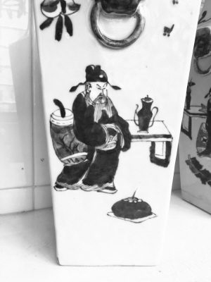 清代豆青釉青花人物花卉纹方瓶:高42厘米,肩宽14厘米。瓶身四面长腹上宽下窄,上部相对两片各有一只辅首衔环耳。