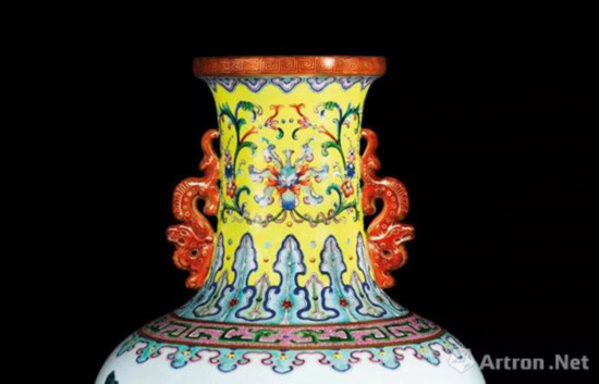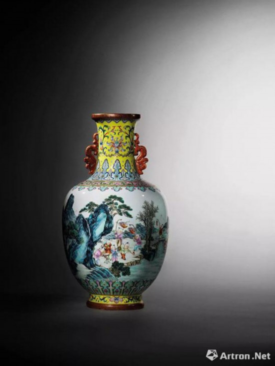 清乾隆 瓷胎洋彩黄地锦上添花莲纹长春百子图双龙耳瓶 矾红六字篆书款