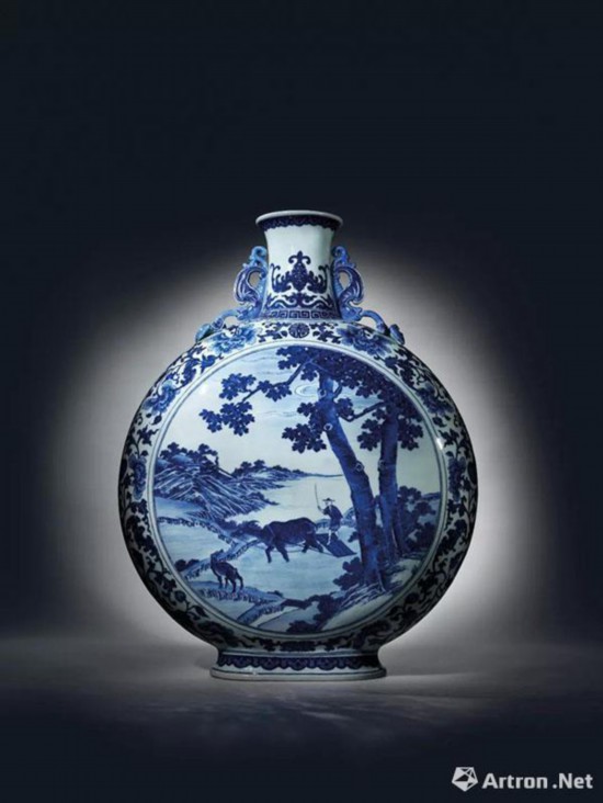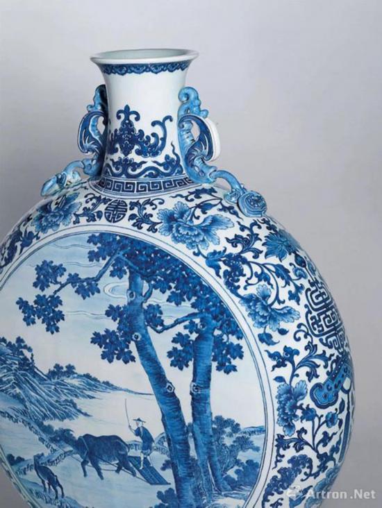 中国以农立国,满清帝王为显示君权天授,非常重视农桑。乾隆帝贵为天子,位居天地之间,每年需主持耕耤礼,祈求风调雨顺、国泰民安,以巩固其政权。“乾隆三希”拍卖中的一件抱月瓶敦硕雄壮,以明艳青花两面绘春耕图,实蕴含崇高政治理想、一国之君对天下一统的期许,故此瓶不只是难得一见的艺术精品,更是彰显皇家正统地位的臻品。