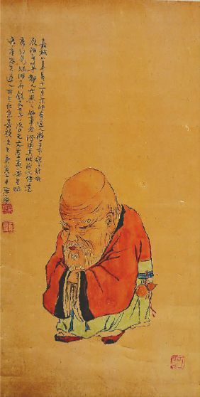与堂兄不同的是,居廉画中的葫芦则完全是沿袭宋元以来作为人物配饰的绘画传统,其传世的两件带有葫芦的画作,均为人物画。有趣的是,两件人物描写的也都为寿星,一件作于清光绪十六年(1890年,广东省博物馆藏) ,一件作于光绪二十五年(1899年,香港艺术馆藏)。两画描写的都是一寿星佝偻着身子,腰间别着葫芦。人物变形夸张,身材矮小,头颅修长,脸庞巨大,乃人间所罕有。其腰间的葫芦,是为容器,亦为法器,抑或为清玩雅物,是寿星的标配,有福禄寿之意。