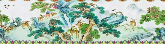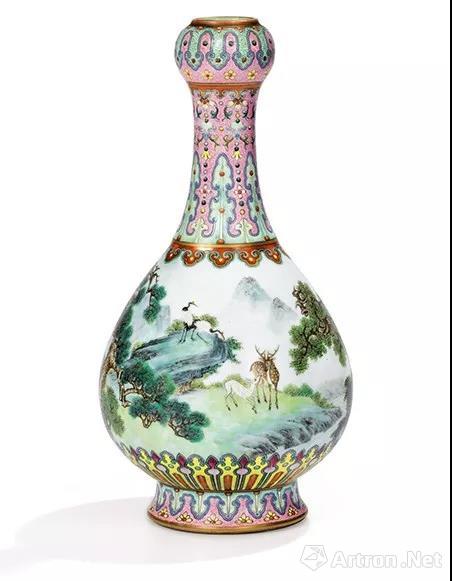 此瓶瓶身绘鹿鹤寿松,寓意福寿康宁:九只祥鹿及五只丹顶白鹤,置嶙峋奇石,古松竞奇,远处山峰烟雾弥漫,画师卓艺可见。纹饰相近之瓶,仅见一例,现收录于巴黎吉美博物馆,较此瓶之器形纹饰,虽有异曲同工之妙,但装饰手法相异。清朝年间,御花园苑饲养鹤鹿,供皇帝玩赏,而本瓶所绘风景,极有可能为乾隆御花园实景写照。鹿,通禄,为寿星坐骑,而鹤则代表长寿,仙人多乘鹤。灵芝珍稀,只长于仙岛。