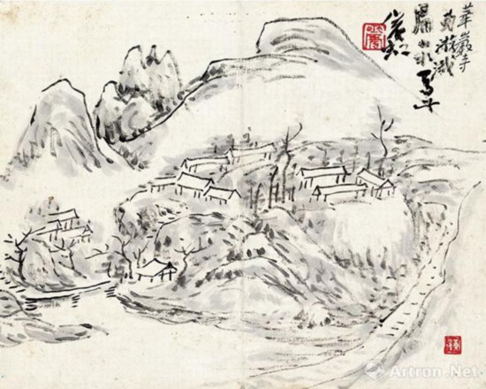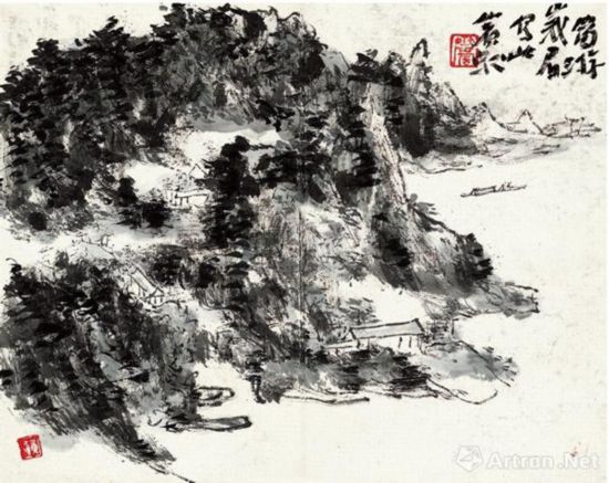 在《蜀游峨眉山水册》中,从“华严寺蜀游峨眉山水写此”这一作品来看,应该起始于北平其间,寥寥数笔勾勒,淡墨一染而过,借景抒情,表达自己心灵的逸气,绘画风格趋于枯淡幽冷,具有鲜明的士人逸品格调。这种近似于黄公望的简笔画,在三四十年代之交所作尤多,其笔简意繁,画格弥淡,清逸朴拙。在“武陵碛”中,他对“知白守黑”进行灵活运用,用回归绘画本源的一点一画发掘出大自然的真实奥义,将笔墨和自然浑然统一,使作品呈现出“黑密厚重、浑厚华滋”的艺术风貌。在技法上有意识地总结出了“五笔七墨”,以皴笔作染,浓淡互破,焦润互渗,以笔为骨,诸墨荟萃,意境清远而深邃,去尽斧凿雕琢之迹,大趣拂拂,有一种郁勃的意象和高华的气格。