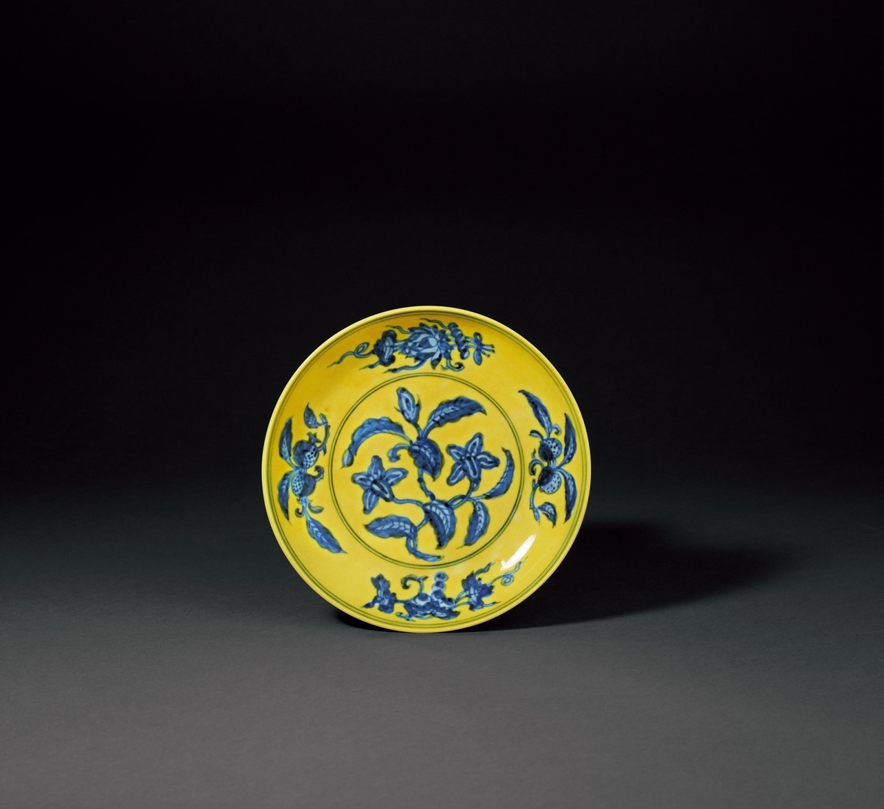 明正德 黄地青花栀子花果纹盘 20cm. Diam.