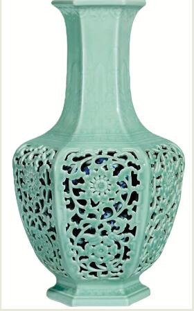 2019年伊始,1月6日,厦门保利新年重磅的一场拍卖中,一件待价而沽的单色釉“清乾隆外粉青釉浮雕芭蕉叶镂空缠枝花卉纹内青花六方套瓶”以1.3亿元人民币落锤,成交价1.495亿元。成为中国大陆的首件过亿瓷器。