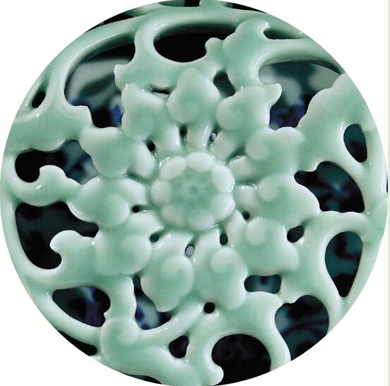 清乾隆外粉青釉浮雕芭蕉叶镂空缠枝花卉纹内青花六方套瓶 局部