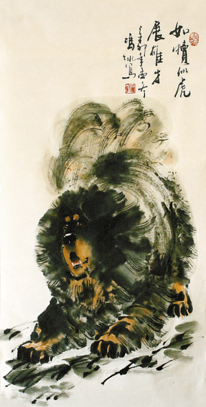 冯冰作画简单,格局、用墨、用色等都符合他自己的定位——“大写意”。这简单并非单调或单薄,而是体现其背后所潜藏的随性。其实,冯冰的画外功夫亦了得。他拍过电影,围棋4段,酷爱各项体育运动、方言专家,会作曲,还曾获得过广州生力啤全国腕力公开赛第七名。这种闪光的特质通常和他的品格混为一体,只待他随性而起、一蹴而就。而他这种随性的可贵就在于能让他笔下的画丰沛灵动,生机盎然。那些对自然的形神把控,对藏獒的细腻拿捏一并跃然于纸上,随他的笔墨瞬间舞动淋漓,让人叹为观止。