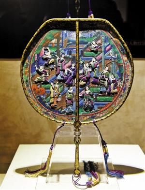朱求真介绍,除象牙扇与描金髹漆扇外,外销扇中最为常见的形制为官扇,俗称百头扇最受人关注,是19世纪中后期盛行的外销扇风格。“此类折扇最大的特色便 是,色彩浓郁艳丽,以中国传统吉祥纹样为边饰,以中国的风景、宫廷景色以及大量的人物为装饰,在工艺上,有些人物的衣服为丝质,裁剪成衣后粘贴上去,人物 的头和手用小块象牙片绘画后粘贴。广绣技法也大量用于外装饰在外销成扇扇面上。”记者 聂灿/文 韩墨/图