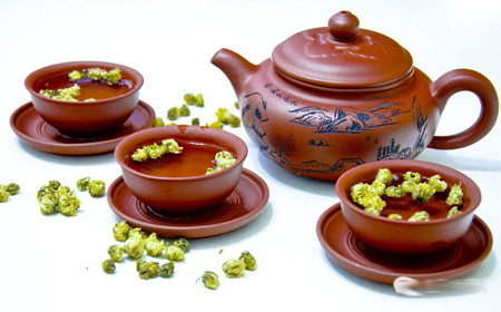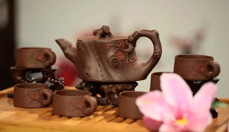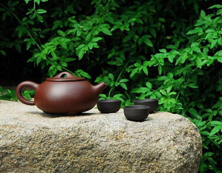 宜兴紫砂壶最为出名,泡茶既不夺茶真香,又无熟汤气,能较长时间保持茶叶的色、香、味。紫砂茶具还因其造型古朴别致、气质特佳,经茶水泡、手摩挲,会变为古玉色而倍受人们青睐。