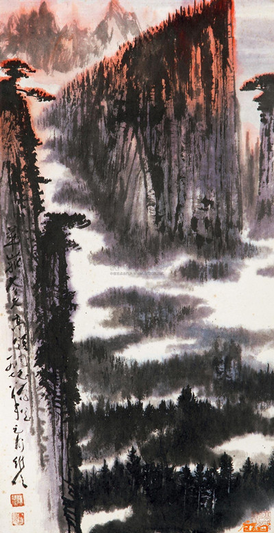 或许是受到西洋画风的影响,在他的许多国画作品中,颜色往往是重彩涂抹,藏蓝、海棠红、赫赤、鸭卵青、蟹壳青、鱼肚白、丁香色、藕荷色……他都可以运用得出神入化、焕然多姿。那山仿若火烧,热烈酣畅;那水恍若沸汤,奔腾欲出;那林宛然盛装,披红挂绿……使人见之则顿感神清气爽、精神百倍!