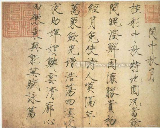 书画俱佳的宋徽宗赵佶有一幅“瘦金体”的《闰中秋月帖》,同样收藏于北京故宫博物院。赵佶的书法极具个人风格,其字线条瘦直挺拔,婀娜多姿。《闰中秋月帖》是一首七言律诗:“桂彩中秋特地圆,况当余闰魄澄鲜。因怀胜赏初经月,免使诗人叹隔年。万象敛光增浩荡,四溟收月助婵娟。鳞云清廓心田豫,乘兴能无赋咏篇。”此帖用笔劲健挺拔又不失妩媚,衬托出诗句本身的意境。在宋徽宗的书法作品中,堪称代表。