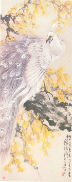 关山月在他《试论赵少昂的绘画艺术》一文中提到,赵少昂虽然师承“岭南三杰”之一的高奇峰,但画风却不像其老师,早就形成了自己独特的个人风格。故人们都 公认他的画风极其新鲜突出,确实达到了“我之为我,自有我在”的艺术境界。在他的花鸟画中,既有传统、师承和写生的笔墨,又将它们与写意融于一炉进行创 新,在不断否定、扬弃中发展了花鸟画创作水平。他的学生桃李满天,但要求学生的画风却不要跟他一样,要创造各自的风格,鼓励“青出于蓝而胜于蓝”。“要为 人所不能,不为人所不为,我过去的画不能代表我。”他在师承“岭南画派”革新精神的同时,也批判地继承了中国画艺术的优良传统。他还强调“古为今用”“洋 为中用”,将古今中外好的养料消化成自己的血液,而且身体力行用了功夫,并且用得很到位,用之来表现时代精神,从而发展了传统。他笔下的花鸟画没有照相式 的照搬,没有工笔画的须眉毕现,也没有文人画的扩张自我,而只有“我之为我,自有我在”的独特画风。大家都知道画白孔雀比画彩孔雀难,而在现藏于香港文化 博物馆,1969年他创作的《霜光素羽》中(见图1),画家却是独特地反其道而行、迎难而上。该画中正在开屏的素白孔雀似乎即刻就要展翅高飞,让观者感受 到美得炫目的孔雀不仅散发着高雅的气度,而且感觉它富有极强的生命力。无怪乎人们形容他的花鸟画“好像被上帝亲吻过”,画面中的花鸟都是有灵魂的。