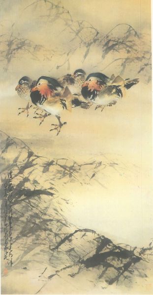 赵少昂精于书法,善题诗,其花鸟画极富诗情画意。他喜以狂草字体在花鸟画上作长题题诗画,行云流水犹如天马行空,无束无拘,个性十足。同时诗画相同相连, 相互映衬,相得益彰,在创作上穷自然之秘奥,极绘画之能事。在他收录于人民美术出版社《赵少昂画集》中的代表作《秋去春来常为伴》中(见图9),他兼工带 写地绘四只鸳鸯栖息于溪畔湿润的沙洲上,前后相偎,安静祥和。背景以淡赭渲染沙渚水面,芦苇瑟瑟,旷野中仅鸳鸯相互依偎,极富“溪上鸳鸯独有情,秋来冬去 常为伴”诗意。