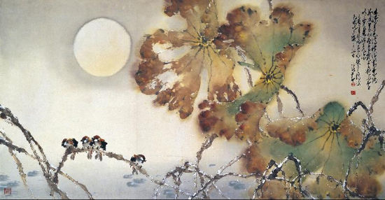 中国美术界历来讲究“书画同体”,书画创作均为笔墨运行,用线条的节奏表现自然的形与意。而画学上讲究的最高原则,为由笔墨产生的“气韵生动”,赵少昂的 花鸟画就完全做到了这一点。特别是画中的题跋从形式上匠心独运,别具一格,与画面浑然一体。创作时意到笔到,一气呵成。其早期作品即已受到诗趣的影响,诗 趣亦成了他在艺术发展的一个方面。如香港文化艺术馆藏、1969年他创作的《迷蒙月色满横塘》(图10)。那半浸水中依旧张开的残荷在做生命最后的坚持, 瑟缩斜伏在枯茎上的麻雀冻得闭上了眼,生命的荣枯无常尽现眼前。尤其是画作中“迷蒙月色满横塘,几叶残荷减翠妆,夜来露冷凝冰雪,吱吱寒雀话荒凉”题跋的 浓情诗意,则使得“诗中有画,画中有诗”的表达层次超脱物象,升华到诗意、哲理的精神境地。
