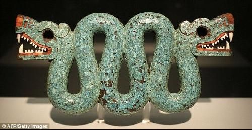 这是由绿松石制作而成的双头蛇,它的年代可能介于1400年至1521年之间,是蒙特苏马进贡给西班牙殖民者科尔特斯的礼物。