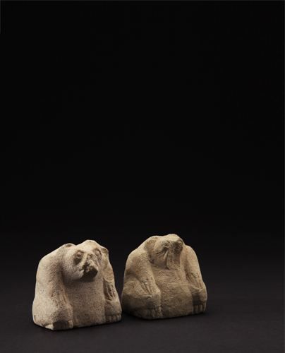 东汉 石刻卧熊席镇(一对) 高7.8厘米。这对席镇卧熊,呈蹲卧状,伸头挺腹,虽残,观者仍能轻易看出熊笨拙有力的神态。
