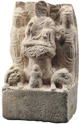 北周保定二年(562年) 张廻香石佛造像 高27.5厘米,厚10.5厘米,宽15~16.5厘米。该造像为黄花石质,雕一佛二菩萨。佛后桃形背光残,面部已残损,身着大衣,手施无畏予愿印,结跏 跌坐于束腰莲花座上,衣裙遮盖座面。两侧站立菩萨,菩萨高发髻,面相丰圆,颈带璎珞,肩搭颇长,下着长裙。佛前两侧各卧一护法狮,中跪坐一人,下为方形座 基。座基正面所刻纹饰:中为莲花香熏,两侧跪坐供养人。背面刻铭文:“保定二年四月八日佛弟子清信女张廻香造玉像一区,为七世父母法界众生等成正觉。”