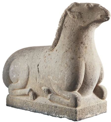 明 石羊 高93厘米。该石羊石灰岩质,颈至肩背生有长鬃一道,挺胸前望,四腿曲卧于长方体石座上。雕刻简练传神,不失为明代石雕佳作。