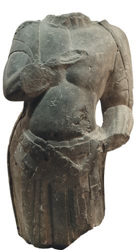 唐 力士造像(残) 残高85厘米,宽42厘米。该力士站立像,石灰岩质地,头部缺失,上身赤裸,肩搭长带,袒胸露腹,下着战裙,腰系蹀躞(diéxiè)带。浑身肌肉饱满, 表现出力感。尤其是突起的腹部,是其艺术点睛之笔,彰显出唐代造型艺术之精湛,今人仿作,难抓其神。