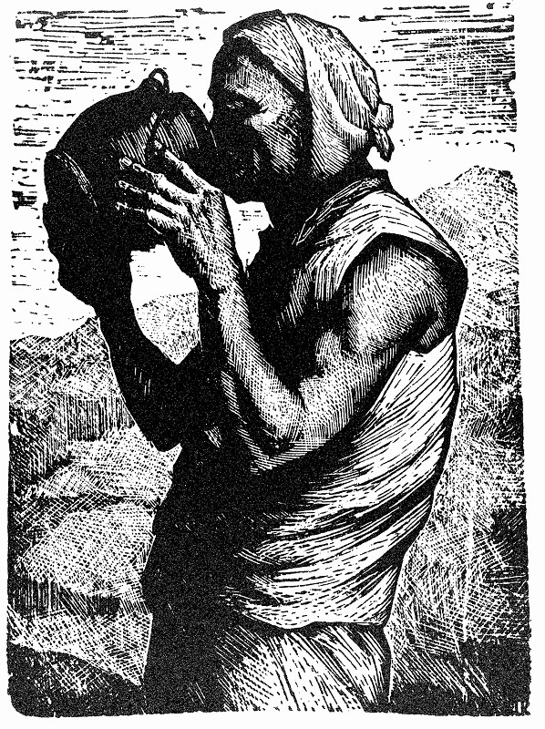 1930年代的中国,内忧外患,人民的苦难,浩如汪洋。力群是目睹身受的。他怎样进行艺术概括呢?就抓树叶。画贫家母女相依为命,挣扎在死亡线上,采树叶果腹。“一石击破水中天”。一个采叶的情节,打开了读者想象的闸门,展示了中国人民苦难生活的广阔现实图景。