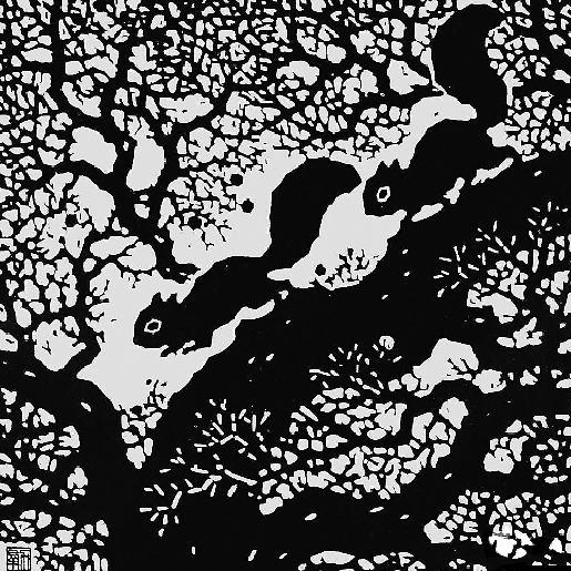 近年刻的黑白木刻《林间》表现在繁茂的树林中,欢快跳跃的松鼠,在互相追逐、戏耍。静寂的山林中,充满着万物的生气和乐观的情绪。在艺术处理上,作者放刀直干,得心应手、自由驰骋的刀法,抒发了野马奔腾式的豪放热情!这是成熟的艺术!自由的艺术!力群自幼即喜爱松鼠,对松鼠的生活有长期的观察了解。《林间》问世后受到群众的热烈欢迎决不是偶然的。