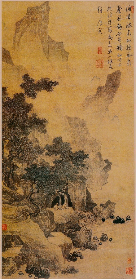 另外两幅——《古木幽篁图》、《看泉听风图》也各有特色,代表了唐伯虎四十岁以后笔力劲健的画风。