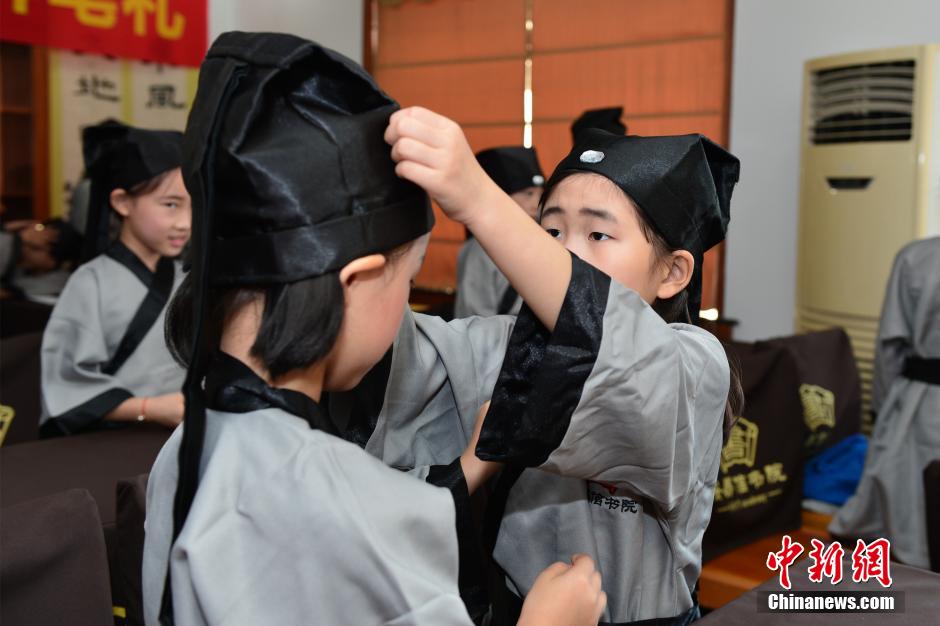 7月12日上午,“三峡门户”湖北宜昌百名学童聚集在当地一家书院,在《高山流水》等古筝乐曲的配合下,身穿传统汉服参加“开笔礼”,弘扬中国传统文化。“开笔礼”上,学童们依次完成了正衣冠、祭拜孔子像、朱砂启智、击鼓明志、启蒙描红、礼谢亲师等礼仪。随后,在老师的引领下,学童们齐声学朗读“弟子规”,并向父母行“敬茶礼”感谢养育之恩。据了解,“开笔礼”是中国传统文化中对少儿开始识字习礼的一种启蒙教育形式。古时,“开笔礼”是极为隆重的典礼,对每个学童来讲有着重大的意义,是人生四大礼之一。刘良伟 摄