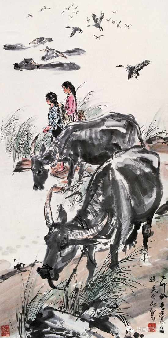 《俯首》作于1984年,笔墨酣畅淋漓、丝丝入扣,在表现人物及动物的神情、动作等方面有天然之妙,浓郁的生活气息扑面而来。颇有宋人翁卷《乡村四月》诗的意趣:“绿遍山原白满川,子规声里雨如烟。乡村四月闲人少,才了蚕桑又插田。”不过作者题款“俯首”,自然还有鲁迅先生“俯首甘为孺子牛”并以此陶写心灵、书写情怀的况味。