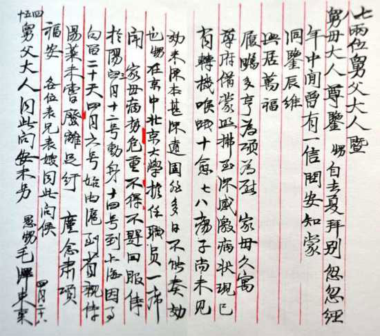 毛泽东写给两个舅舅文玉瑞、文玉卿的信。(毛主席写东西也要看对象。如果对方文化程度相对较低,比如是普通群众,或他家乡的一些亲属,他写得就会工整些,方便他们识别,与我们常看到的草书有很大区别。)(供图:齐得平)
