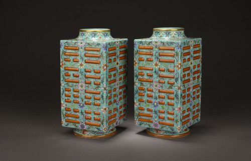 康熙青花万寿尊松石绿地洋彩洋花八卦纹琮式瓶一对_乾隆