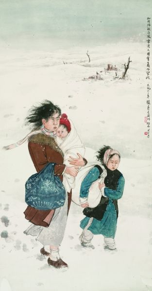 同样完成于1939年的《从城市撤退》可谓关山月这一时期的代表作。显而易见,它与前面作品有着完全不同的笔墨语言和审美情境。扑面而来的是一种苍茫和厚重的气质,关山月用干笔擦写、湿笔晕染,以达到传统山水画长卷的“气质”和“意境”:画面的主角是那些背负行李、举家仓皇离开城镇并逃往郊外安全地带的难民,但实际上,黑烟四起的城镇、破败不堪的建筑、敌机盘桓的空域、代表未知的野外,这些“环境”的笔墨营造远比细略难辨的“人物”更能吸引观众眼球。作者巧妙地将中国传统山水画的“行旅图”置换为一幅“为国难写真”的“流民图”,传统的绘画语言结构与新的表现母题相结合,可以看到关山月对自己特点的清醒认识和熟练运用,其个人审美风格倾向已露峥嵘。
