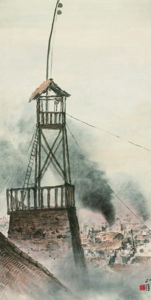 创作于1939年的《三灶岛外所见》以一种照相式的观看记录战争的残酷:右上角敌机掠过,画面主体是烟火中腾飞的木船碎片、东倒西歪的桅樯和落水呼号的船民,这些不稳定因素强化了画面的紧张感,突出了人物所处的悲剧氛围。用笔和设色上注重物体的明暗体积,没有过于在意传统的笔墨语言,专注于制造真实可信的凄惨场景,作者面对家国危亡“为国难写真”的立场显而易见。