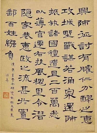 节书《水经注》,一件小小的作品,文字来自《水经注》。署款“文凤”,钦印“文凤书印”。如许要强的女子,出手的却是“柔”意十足的隶书。或许只能若此,才能刚柔相济,书写出不同凡响的意味来。她的隶书是刚柔相映、风生水起的。
